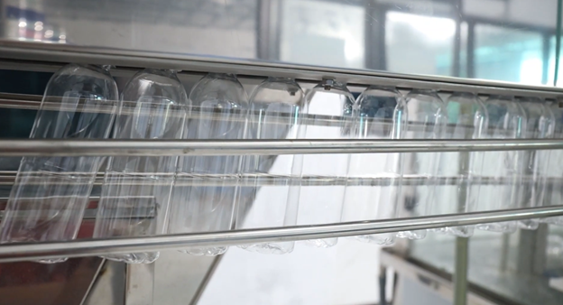 - Hệ thống rửa: Vòi phun áp lực kết hợp băng tải dẫn chai.